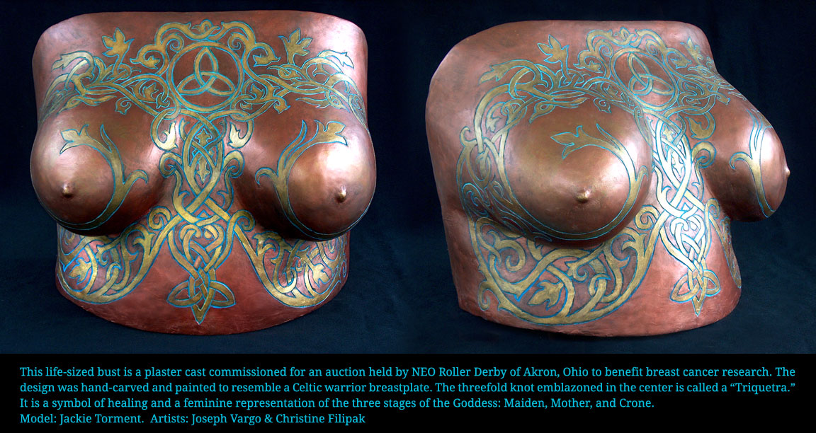 This life-sized bust is a plaster cast commissioned for an auction held by NEO Roller Derby of Akron, Ohio to benefit breast cancer research. The design was hand-carved and painted to resemble a Celtic warrior breastplate. The threefold knot emblazoned in the center is called a "Triquetra." It is a symbol of healing and a feminine representation of the three stages of the Goddess: Maiden, Mother, and Crone. Model: Jackie Torments. Artists: Joseph Vargo and Christine Filipak